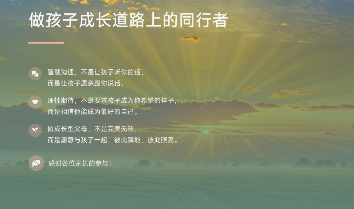 会议开始,杨晶晶以“理性期待,智慧沟通”为题,围绕“成长型父母”主题,系统讲解了成长型思维、自我决定论、积极心理学三大理论支柱,并分享了共情式倾听、好奇式提问、赋能式反馈等实用亲子沟通工具,引导家长转变教育角色,从“管理者”转变为“支持者”与“陪伴者”,以理性期待和智慧沟通助力孩子应对大学成长挑战。
